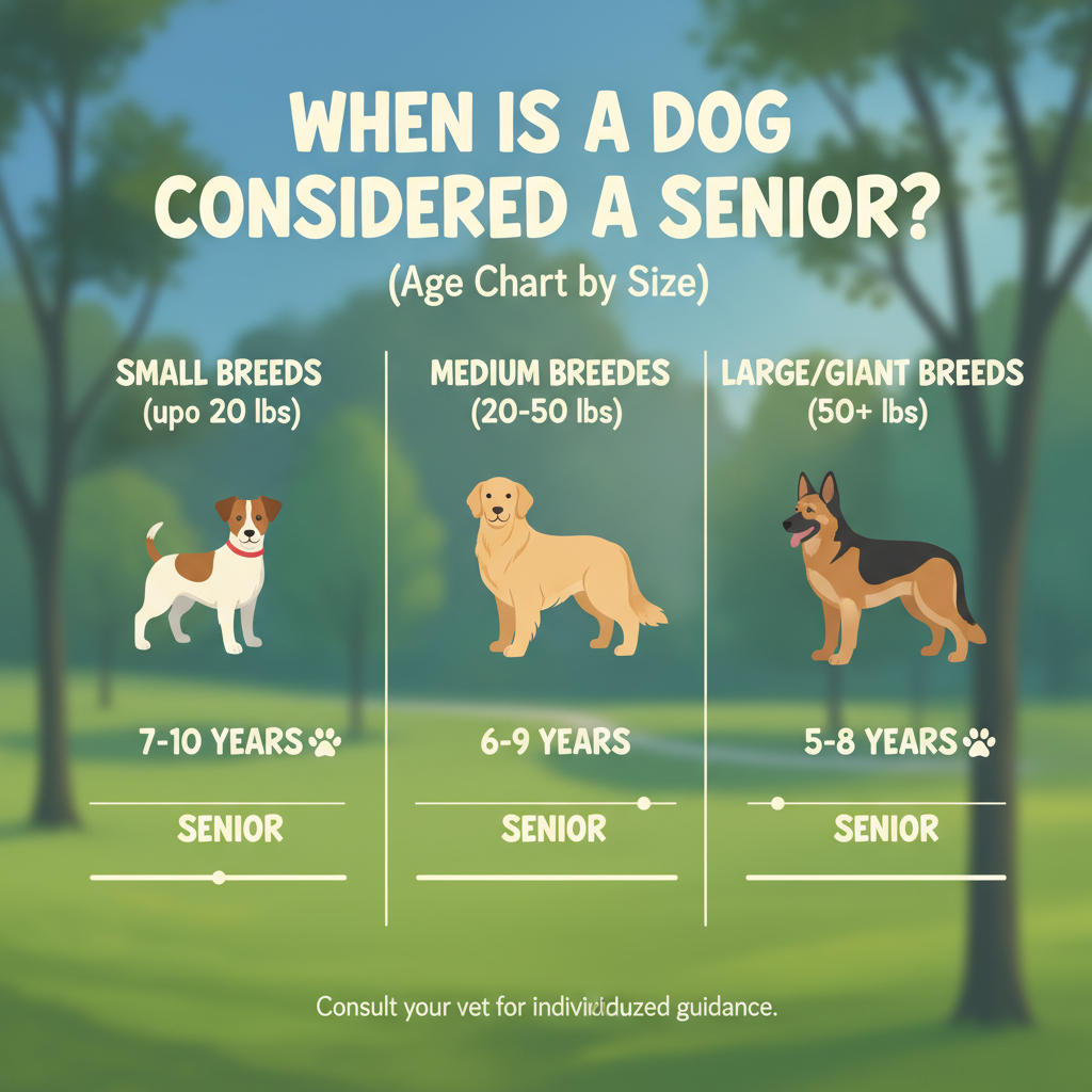 When is a dog considered a senior? Now you know it depends entirely on their size. Small dogs at 10-11, medium at 8-10, large at 6-8, and giant breeds as early as 5-7 years old.